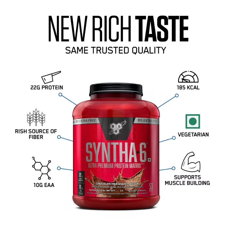 BSN Syntha-6 یک پروتئین چندمنبعی و با کیفیت بالا است که شامل وی کنسانتره، وی ایزوله، کازئین، آلبومین و پروتئین شیر می‌باشد. این ترکیب باعث رهایش تدریجی آمینواسیدها در بدن شده و برای افزایش حجم عضلانی، ریکاوری سریع و جلوگیری از تجزیه عضلات ایده‌آل است.